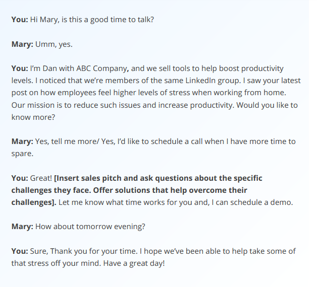 Cold Calling เป็นวิธีการชั้นนำในการเริ่มต้นการติดต่อฝ่ายขายในภาคธุรกิจ B2B วิธีหนึ่งในการสร้างสายสัมพันธ์กับเจ้าของธุรกิจและผู้มีอำนาจตัดสินใจคือการสร้างความสัมพันธ์ร่วมกัน ในตัวอย่างสคริปต์การโทรแบบเย็นนี้ Lead Squared มีการกล่าวถึง LinkedIn หลักฐานทางสังคมว่าผู้โทรและผู้มีแนวโน้มจะแบ่งปันการเชื่อมต่อ