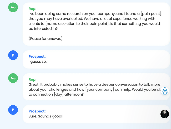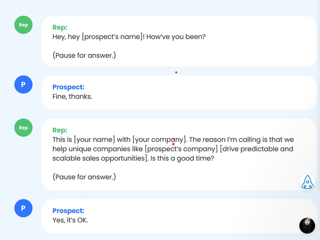 - ยืนยันความพร้อม – เนื่องจากผู้มีโอกาสเป็นลูกค้าของคุณเป็นนักธุรกิจที่มีงานยุ่ง สิ่งสำคัญคือต้องแน่ใจว่าพวกเขามีเวลาไม่กี่นาทีที่จะรับสาย คุณจะไม่ปิดการขายใดๆ หากบุคคลนั้นให้บริการลูกค้าหรือดับไฟในเบื้องหลัง นอกจากนี้ คุณยังแสดงความเคารพต่อผู้มีโอกาสเป็นลูกค้าด้วยการขออนุญาตเพื่อดำเนินการต่อ คุณยังสามารถยืนยันได้ว่าคุณกำลังพูดคุยกับผู้มีอำนาจตัดสินใจที่ธุรกิจ