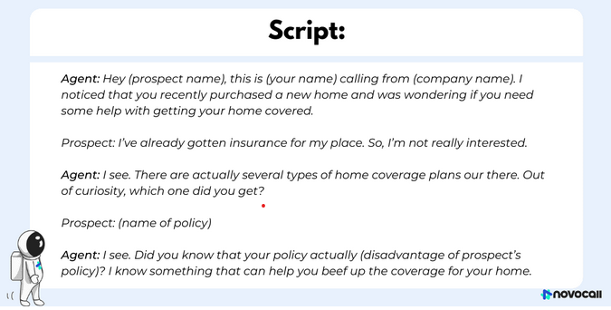 ตัวแทนขายประกันมักพึ่งพาสคริปต์การโทรแบบเย็นเพื่อเพิ่มประสิทธิภาพการติดต่อกับลูกค้าเป้าหมาย ในตัวอย่างเทมเพลตการโทรแบบปิดเสียงนี้ Novocall จะสรุปการสนทนากับผู้มีแนวโน้มจะเป็นลูกค้าที่เอาชนะการคัดค้านเบื้องต้นได้