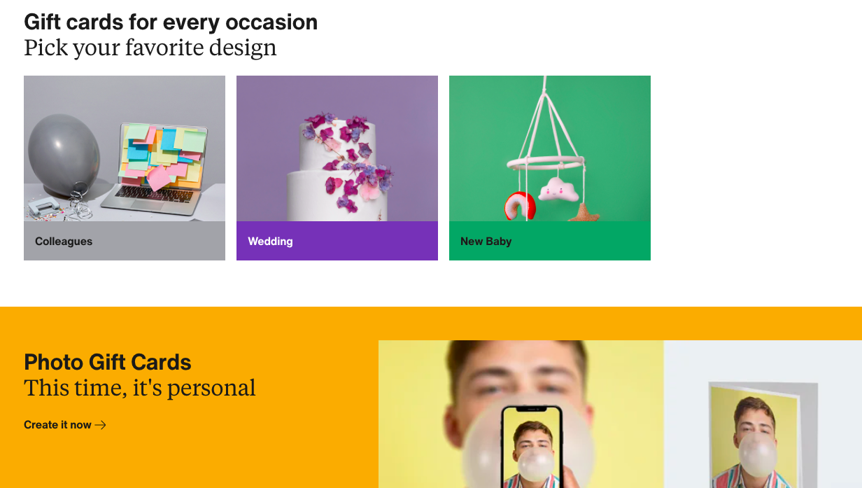- ทำให้บัตรของขวัญสะดุดตา ลงทุนในการออกแบบและเปลี่ยนเป็นประจำเพื่อให้น่าสนใจยิ่งขึ้น คุณยังสามารถทดสอบการออกแบบ A/B สองสามแบบเพื่อดูว่าแบบใดขายดีที่สุด ตัวอย่างที่ดีคือ Amazon ที่มีการออกแบบบัตรของขวัญมากมายสำหรับทุกโอกาส