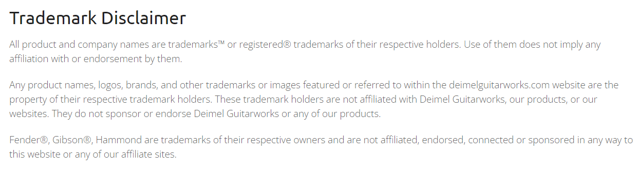 การรวมผลิตภัณฑ์ที่มีเครื่องหมายการค้าหรือชื่อแบรนด์บนเว็บไซต์หรือสื่อการตลาดของคุณอาจทำให้เข้าใจผิด ข้อจำกัดความรับผิดชอบเครื่องหมายการค้าระบุว่าคุณไม่ได้มีส่วนเกี่ยวข้องกับแบรนด์อื่นๆ เหล่านี้