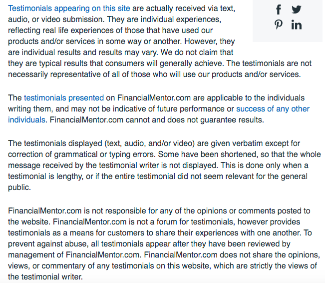 คำปฏิเสธความรับผิดชอบระบุว่าประสบการณ์หรือผลลัพธ์ที่แบ่งปันในคำรับรองจะไม่รับประกัน ข้อจำกัดความรับผิดชอบปกป้องธุรกิจจากลูกค้าที่ไม่มีความสุขที่อาจเชื่อว่าพวกเขาได้รับสัญญาผลลัพธ์บางอย่าง
