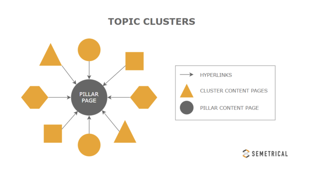 มีการเพิ่มประสิทธิภาพในหน้าบางอย่างที่คุณสามารถทำได้เพื่อสร้างอำนาจสำหรับเพจ YMYL ของคุณและปรับปรุง EAT ประการแรก คุณควรตรวจสอบให้แน่ใจว่าโครงสร้างการเชื่อมโยงภายในของคุณทำให้แน่ใจว่ามีหลายลิงค์ในเว็บไซต์ของคุณที่ชี้ไปยังหน้า YMYL ที่สำคัญ เพื่อให้ Google สามารถจัดทำดัชนีได้ง่าย การสร้างหน้าเสาหลักและหน้าคลัสเตอร์เป็นกลยุทธ์ที่มีประสิทธิภาพสำหรับสิ่งนี้ หน้าหลักทำหน้าที่เป็นศูนย์กลางข้อมูลหรืออาจเป็นหน้าธุรกรรม และเป็นที่ที่คุณต้องการเบี่ยงเบนการรับส่งข้อมูลส่วนใหญ่ของคุณ คุณสามารถสร้างหน้าคลัสเตอร์ที่มีเนื้อหาสนับสนุน และใช้สิ่งเหล่านี้เพื่อเชื่อมโยงไปยังหน้าหลัก และช่วยสร้างสิทธิ์สำหรับเพจนี้ การผลิตเนื้อหาที่มีประโยชน์เชิงความหมายและการสร้างโครงสร้างการเชื่อมโยงภายในของคุณเป็นการบ่งชี้ให้ Google ทราบว่าคุณมีความรู้ในหัวข้อนี้โดยเฉพาะ ดังนั้น Google จะถือว่าหน้าของคุณมีความเกี่ยวข้องสูงและจัดอันดับให้สูงขึ้นใน SERP ทำให้ผู้ชมเป้าหมายของคุณค้นหาคุณทางออนไลน์ได้ง่ายขึ้น นี่คือไดอะแกรมเพื่อลดความซับซ้อนของแนวคิด:
