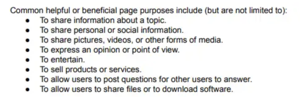 Google ประเมินวัตถุประสงค์ของหน้าเว็บและให้คุณค่าสูงบนหน้าเว็บที่กำหนดขึ้นเพื่อให้ข้อมูลที่เป็นประโยชน์หรือมีจุดประสงค์ที่เป็นประโยชน์อื่นๆ แก่ผู้ใช้ ในขณะที่หากหน้าถูกสร้างขึ้นเพียงเพื่อก่อให้เกิดอันตรายหรือหลอกลวงผู้ใช้ หน้านั้นจะให้คะแนนคุณภาพต่ำที่สุดและจะถูกจัดอันดับตามนั้นไม่ดี ซึ่งรวมถึงหน้าเว็บที่เต็มไปด้วยโฆษณาและสร้างขึ้นเพื่อจุดประสงค์ในการทำเงินเท่านั้น