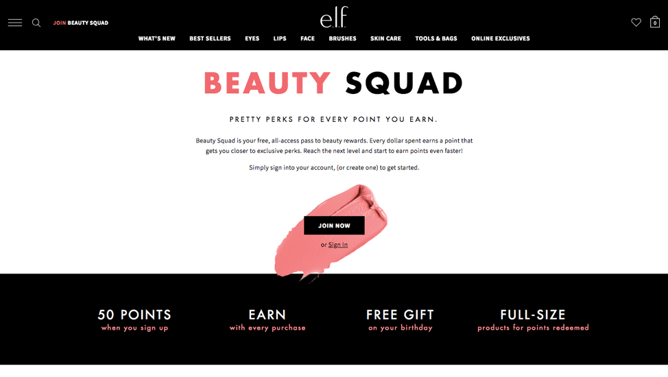 โปรแกรมรางวัล Beauty Squad ของ Elf เสนอ “สิทธิพิเศษมากมายสำหรับทุกจุดที่คุณได้รับ” ใช้ระดับที่หรูหราสามระดับเพื่อสร้างความสัมพันธ์ที่ยั่งยืนกับลูกค้าที่ซื่อสัตย์ของพวกเขา พวกเขายังทำงานที่ยอดเยี่ยมในการสร้างแบรนด์ประสบการณ์จากบนลงล่าง เพื่อให้แน่ใจว่าโปรแกรมของพวกเขาดูดีพอๆ กับผลิตภัณฑ์ของพวกเขา