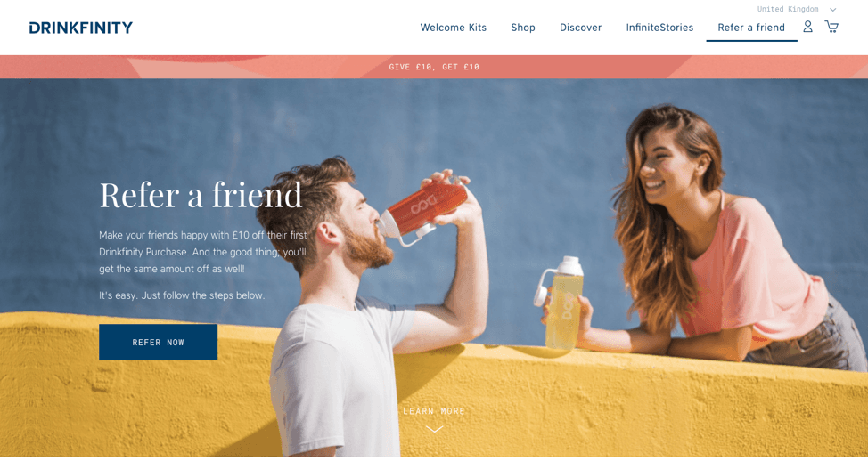 Drinkfinity เลือกที่จะมุ่งเน้นไปที่การสร้างลูกค้าอ้างอิงมากขึ้นด้วยโปรแกรมรางวัลของพวกเขา หน้าคำอธิบายที่สวยงาม ทำให้กระบวนการนี้เข้าใจง่ายและตั้งค่าสมาชิกเพื่อให้มีการอ้างอิงมากขึ้นใน อนาคต