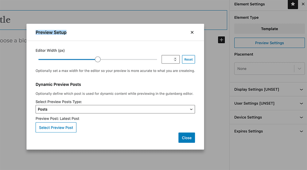 เนื่องจากพื้นที่ที่องค์ประกอบเทมเพลตของคุณจะอยู่มีแนวโน้มที่จะแตกต่างจากมุมมองของตัวแก้ไข wp-admin คุณสามารถตั้งค่าคอนเทนเนอร์สำหรับการแสดงตัวอย่างของคุณภายในตัวแก้ไขโดยใช้การตั้งค่าการแสดงตัวอย่างเทมเพลต กำหนดความกว้างโดยใช้แถบเลื่อนหรือกำหนดความกว้างของพิกเซลสำหรับการแสดงตัวอย่างของคุณ