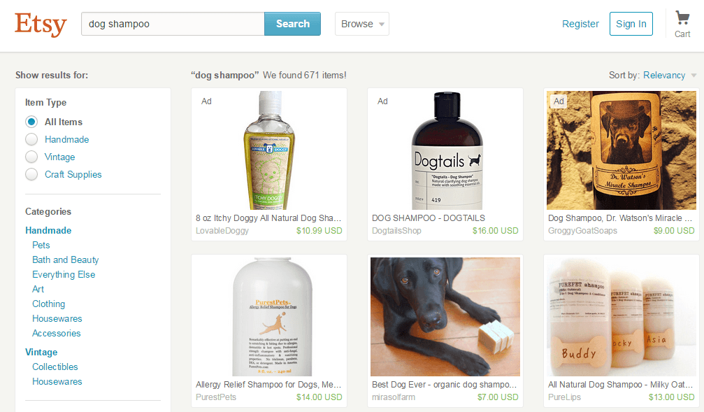 ตัวอย่าง : ใน Etsy โฆษณาเนทีฟมักจะมีลักษณะเหมือนกับผลการค้นหาทั่วไป โดยมีตัวสร้างความแตกต่างเพียงไอคอนเดียวคือไอคอน "โฆษณา" สีขาวที่ด้านบนซ้าย ผู้โฆษณาอาจกำหนดเป้าหมายผู้บริโภคที่เคยค้นหาผลิตภัณฑ์ที่คล้ายคลึงกันหรือซื้อจากร้านค้าของตนในอดีต