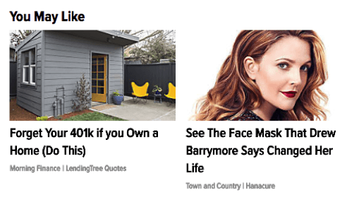 ตัวอย่าง : ตัวอย่างด้านล่าง นำมาจาก Huffington Post ปรากฏในเรื่องข่าวทั้งบนเดสก์ท็อปและมือถือ ผู้โฆษณาอาจรวบรวมข้อมูลผู้บริโภคหรือใช้การกำหนดเป้าหมายโฆษณาใหม่เพื่อเตือนผู้ใช้เกี่ยวกับผลิตภัณฑ์หรือบริการที่พวกเขาเคยสำรวจมาก่อน โดยนำเสนอเป็นคำแนะนำ