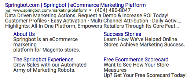 ตัวอย่าง : โฆษณา Springbot ด้านล่างดูเหมือนรายการการค้นหาทั่วไป แต่ได้รับการเผยแพร่ผ่าน AdWords คุณสามารถบอกได้ว่าผลการค้นหาเป็นโฆษณาเมื่อมีภาพ "โฆษณา" สีเขียวถัดจาก URL