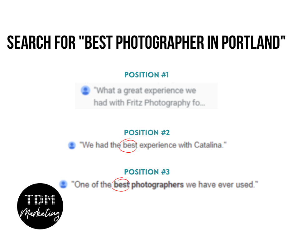 สิ่งนี้จะมีความสำคัญเพิ่มขึ้นอย่างต่อเนื่องเมื่อ Google อัปเดตฟังก์ชันนี้ ยิ่งคุณมีคำวิจารณ์มาก ข้อความบทวิจารณ์ก็จะยิ่งมากขึ้น และโอกาสที่คุณจะได้แสดงสำหรับการค้นหามากขึ้น