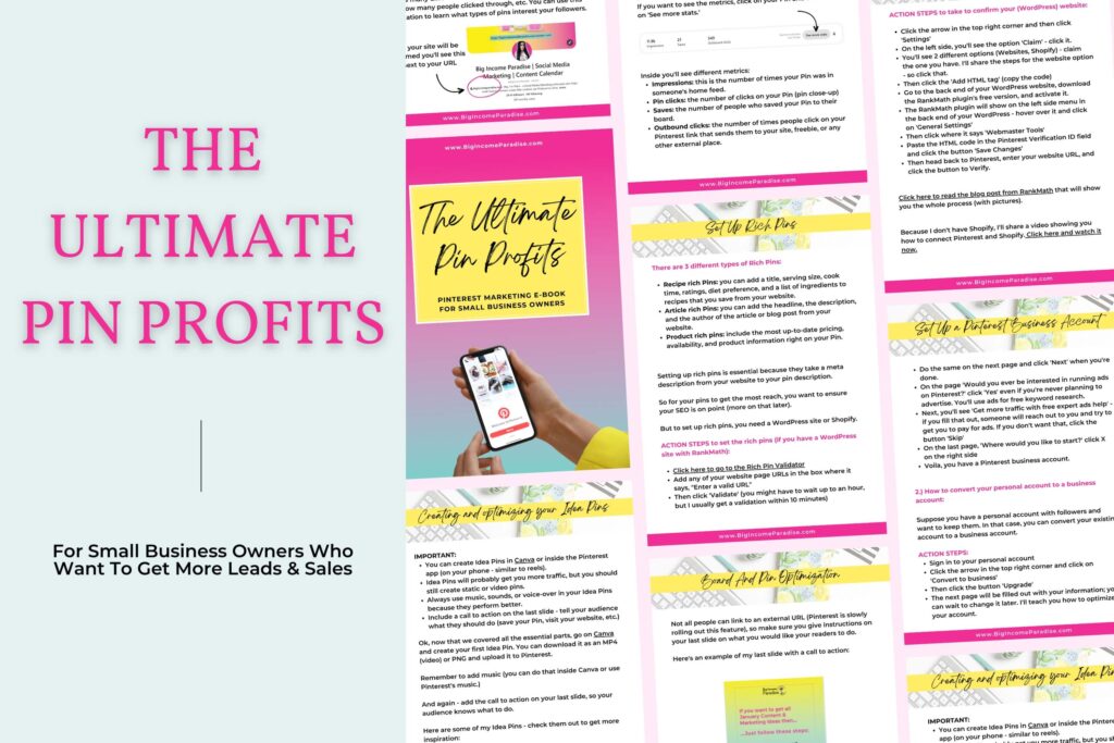 - The Ultimate Pin Profits – คุณสามารถเรียนรู้วิธีรับโอกาสในการขายและยอดขายนับพันจาก Pinterest ด้วย e-book ของฉัน เรายังมีกลุ่มวีไอพีที่คุณสามารถถามคำถามและเราจะช่วยเหลือคุณ บอกลาการเลื่อนที่ไม่รู้จบและสวัสดีกับโอกาสในการขายและการขายที่ต่อเนื่อง อย่าปล่อยให้การแข่งขันของคุณล้ำหน้า รับเครื่องมือที่จำเป็นในการเพิ่มระดับธุรกิจของคุณวันนี้ ซื้อ e-book ของฉันวันนี้ แล้วมาเริ่มต้นเส้นทางสู่ความสำเร็จของ Pinterest กันเถอะ!