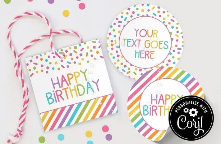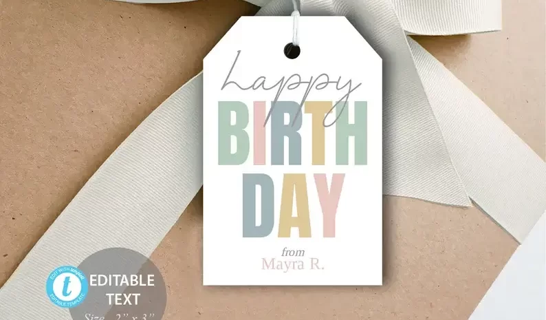 ชุดแท็กของขวัญวันเกิดที่พิมพ์ได้แสนสนุกนี้มีทั้งแท็กสี่เหลี่ยมและกลมในดีไซน์ลายทางและลูกปาหลากหลายแบบ ป้ายของขวัญหลากสีสันสามารถติดไว้กับของขวัญด้วยการเจาะรูหรือห่อด้วยคุกกี้ เนื่องจากข้อความสามารถแก้ไขได้ จึงสามารถปรับเปลี่ยนข้อความให้เป็นคำอวยพรวันเกิดที่สมบูรณ์แบบได้