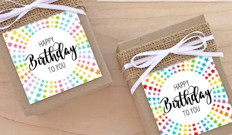 การติดแท็กของขวัญวันเกิดที่มีสีสันเหล่านี้เข้ากับของขวัญจะส่งผลให้มีความคิดเห็นติดตามผลในเชิงบวก แท็กของขวัญที่พิมพ์ได้มีข้อความสุขสันต์วันเกิดล้อมรอบด้วยดาวหลากสี เพียงซื้อ ดาวน์โหลด และพิมพ์แท็กของขวัญเพื่อเพิ่มคำอวยพรที่มีสีสันให้กับของขวัญวันเกิด