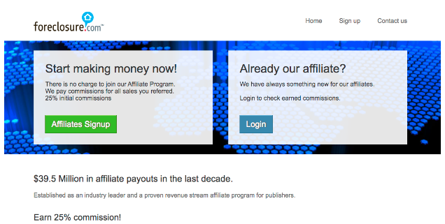 โปรแกรมพันธมิตร Foreclosure.com มอบค่าคอมมิชชั่น 25% สำหรับทุกๆ การแนะนำสมาชิกที่ประสบความสำเร็จ เป็นเรื่องดีที่ทราบว่า Foreclosure.com นำเสนอโปรแกรมพันธมิตรที่ได้รับการปรับปรุงสำหรับพันธมิตรที่มีทราฟฟิกสูง