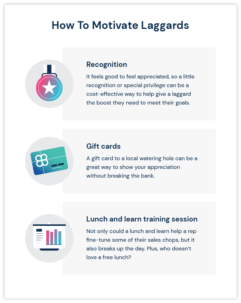 โดยทั่วไปแล้วผู้ที่ล้าหลังคือตัวแทนระดับเริ่มต้นที่พยายามดิ้นรนเพื่อให้ได้ยอดขายตามเป้าหมาย ผู้ล้าหลังสามารถได้รับประโยชน์จากสิ่งจูงใจที่ปรับให้เหมาะกับประสิทธิภาพของพวกเขา