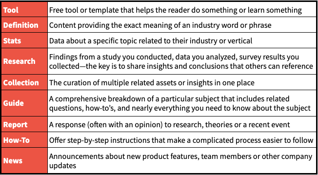 เราพบว่าเนื้อหาหลักเก้าประเภทประกอบขึ้นเป็นทรัพย์สินที่เชื่อมโยงได้มากที่สุดในบล็อกการตลาด: