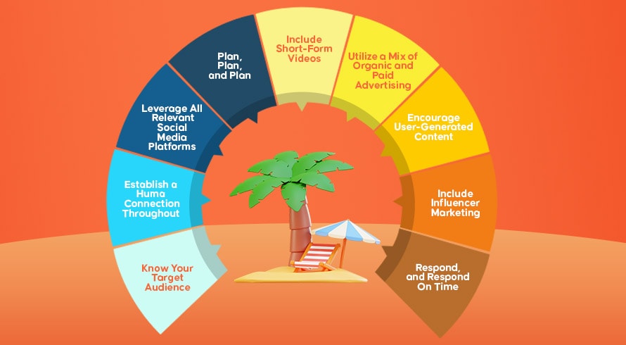 สิ่งนี้ไม่สามารถทำได้เพียงแค่เปิดบัญชีโซเชียลมีเดียในทุกแพลตฟอร์มและโพสต์รูปภาพตัวเลือกที่พักและอาหารเมื่อใดก็ตามที่คุณรู้สึกต้องการ แต่ถ้าคุณต้องการการมีส่วนร่วมทางโซเชียลมีเดียที่เชื่อมต่อกับผู้ชมของคุณและช่วยสร้างแบรนด์ที่ประสบความสำเร็จดังที่กล่าวไว้ข้างต้น กลยุทธ์คือสิ่งที่คุณต้องการ ด้านล่างนี้คือ 9 กลยุทธ์ที่มีประสิทธิภาพที่ช่วยให้คุณทำการตลาดบนโซเชียลมีเดียให้เกิดประโยชน์สูงสุด