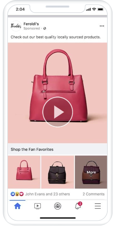โฆษณา Instant Experience จับคู่หลายรูปแบบ (เช่น วิดีโอและภาพหมุน) เพื่อใช้ประโยชน์จากแคมเปญที่ดีที่สุดของคุณ แนวทางมัลติมีเดียนี้ดึงดูดความสนใจของผู้ใช้ในขณะที่ให้คุณค่าผ่านรูปภาพ ข้อความ สินค้าที่ติดแท็ก และอื่นๆ