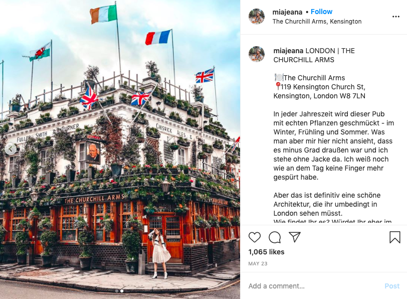 Londra, Kensington'daki bir restoran ve pub olan Churchill Arms, 1986'dan beri binanın dış duvarlarını süsleyen çiçek yerleştirmeleriyle ünlüdür. Bu, barın Londra'daki en muhteşem ve Instagrammed barlarından biri haline gelmesini sağlamıştır.