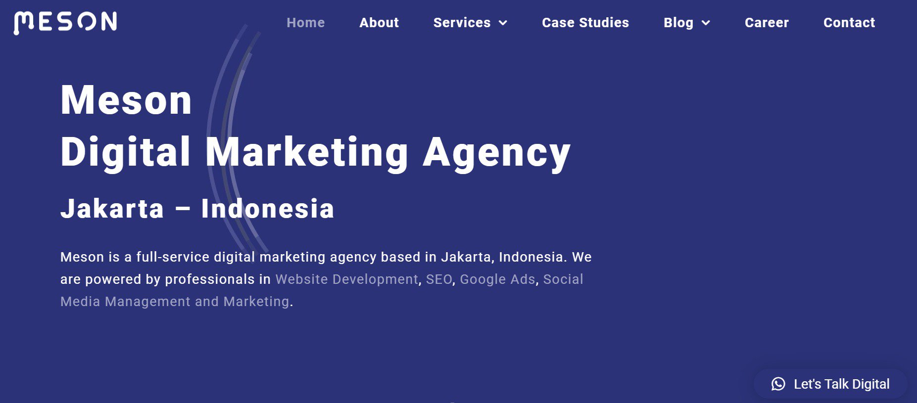 2018'den beri faaliyet gösteren Meson, orta ölçekli ve küçük işletme girişimleri için dijital pazarlama hizmetleri sunmaya devam ediyor. Hizmetleri sosyal medya ve SEO/SEM pazarlaması ve dijital reklamlara odaklanmaktadır. Ayrıca, web sitesi geliştirmenin yanı sıra pazarlama danışmanlığından oluşur.