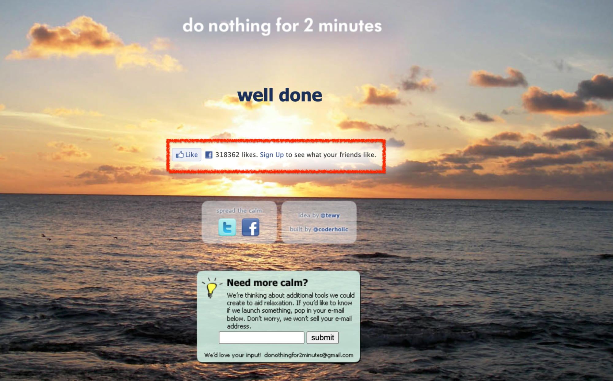 Fikir, insanları duraklatmak, ekrana bakmak, dalgaların sesini dinlemek ve iki dakika rahatlamaktı. Hepsi farelerine dokunmadan. İki dakikanın sonunda bir istem, kullanıcılardan Facebook sayfasını beğenmelerini ve kaydolmalarını istedi.