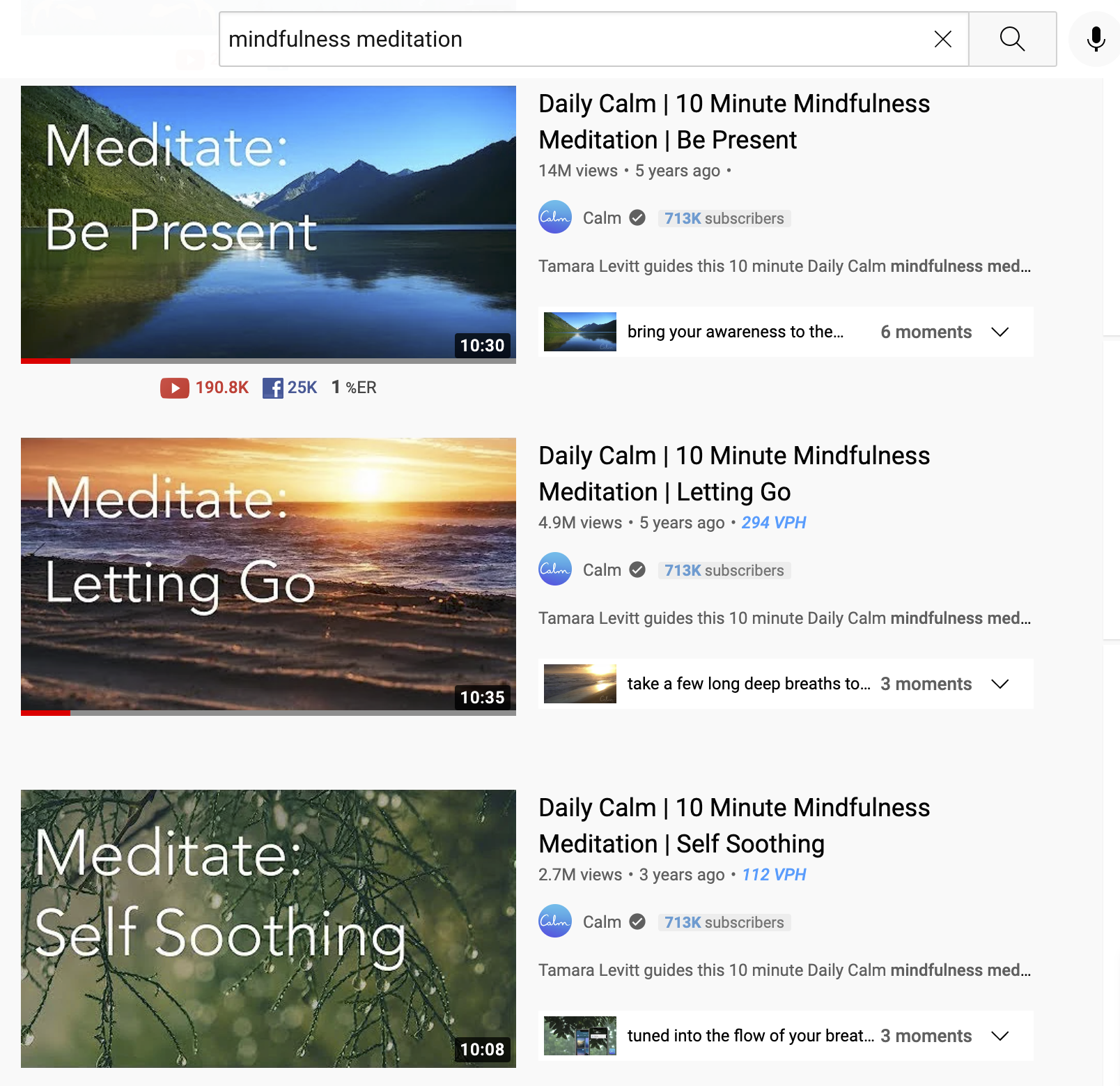 Örneğin, "farkındalık meditasyonu" anahtar kelimesi 28.000'den fazla aylık arama yapar. Bu terim için YouTube'da hızlı bir arama yaptığınızda, Calm'ın üç videosunun art arda sonuç sayfasına hakim olduğunu göreceksiniz: