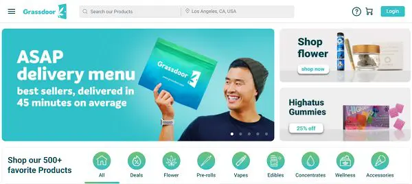 Grassdoor bir esrar dağıtım hizmeti şirketidir. Ve bunlar sadece normal teslimat hizmetiniz değil; en hızlı onlar. Grassdoor, ürünlerini LA ve Orange County'de 40 dakika veya daha kısa sürede kapınıza teslim ediyor.