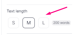 5. ' Metin uzunluğu'nu seçin (S - 100 karakter, M -200 karakter, L - 300 karakter uzunluğunda metin).