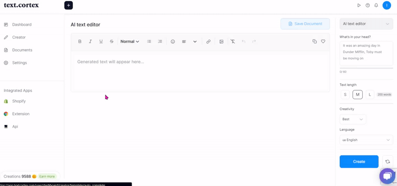 TextCortex, ihtiyacınız olan her türlü içeriği oluşturmanıza yardımcı olabilecek, kullanım senaryosu modülü tabanlı bir AI yazma yardımcısıdır.