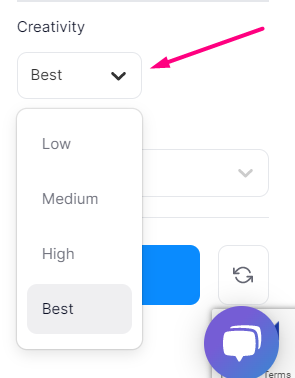 'Yaratıcılık' düzeyini seçin (Düşük, Orta, Yüksek, En İyi) — Yüzde 0 ile 100 arasında bir ölçekte, tarzınıza en uygun yaratıcılık düzeyini deneyebilirsiniz.
