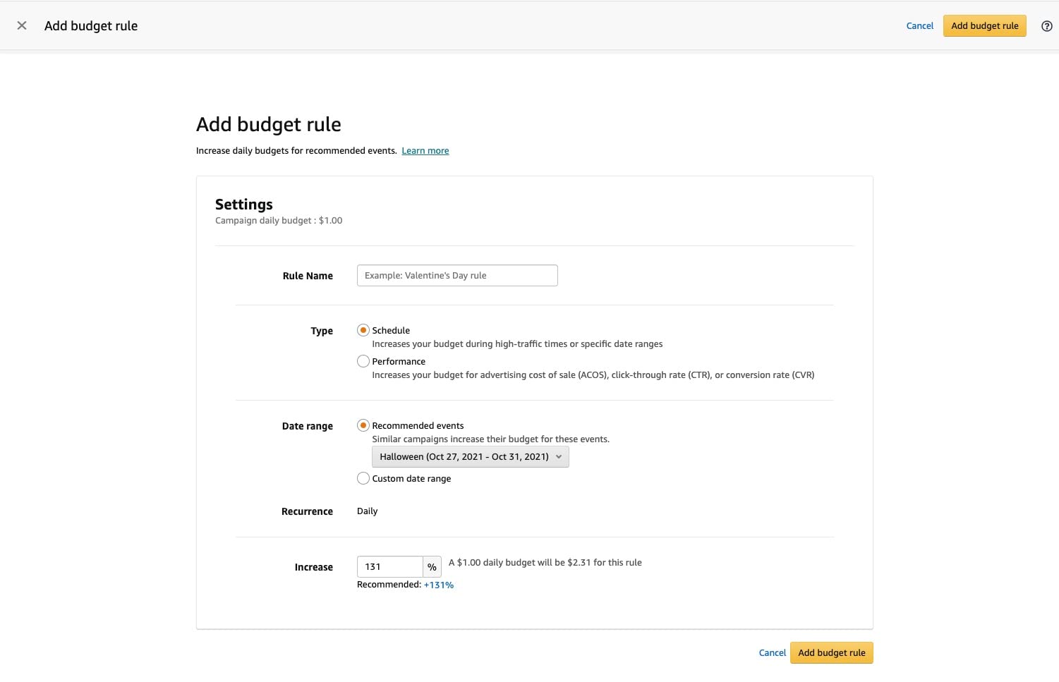 Bütçe Kuralları, tüm ülkelerde kullanılabilen yeni bir Amazon reklam özelliğidir. Tanımladığınız bir dizi kurala dayalı olarak bütçe değişikliklerini otomatikleştirmeyi amaçlar. Kuralları tanımlamak için iki seçenek vardır: