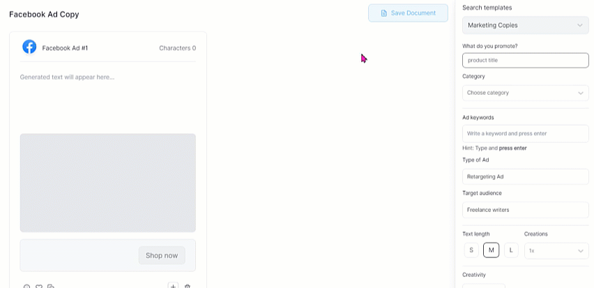 TextCortex gibi AI yazma yardımcıları, blog içeriğinizi Facebook Reklamı veya Facebook gönderisi biçiminde yeniden kullanmak isteyip istemediğinize bu konuda yardımcı olabilir. ' Facebook Reklamı ' seçeneği şu şekilde çalışır: