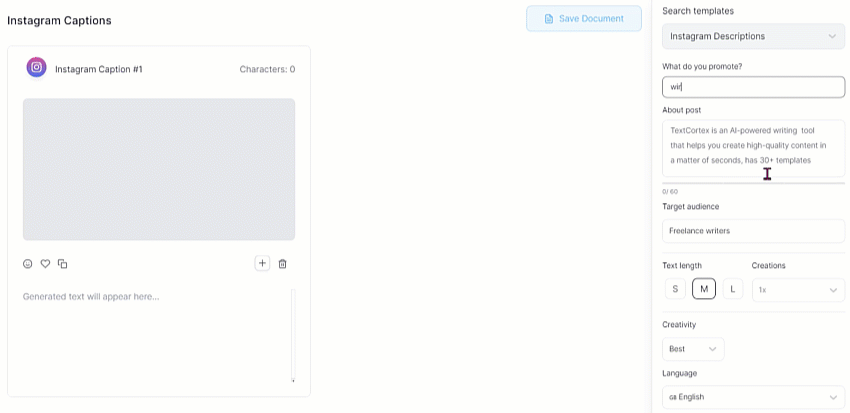 2. Blog gönderinizin temel öğelerini vurgulayacak etkileyici bir Instagram açıklaması oluşturun . TextCortex'in ' Instagram yazısı ' seçeneği size bu konuda yardımcı olabilir: