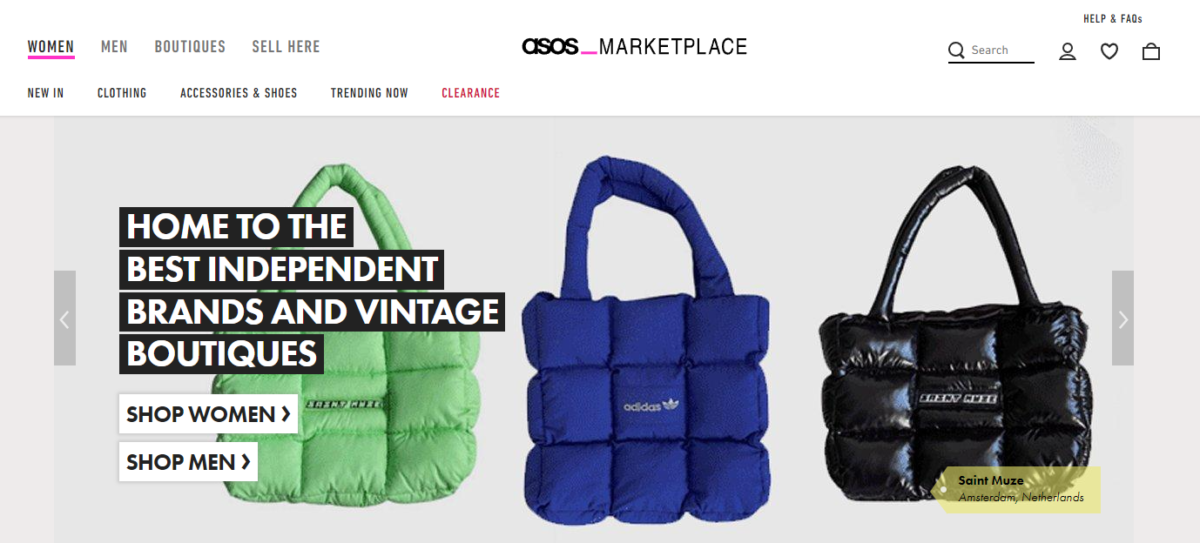 ASOS, bin bağımsız etiket ve vintage butikten oluşan bir koleksiyondur. Pazar yeri, uluslararası bir izleyici kitlesine son derece küratörlü ürünler sunar. Çok trend bir butiğiniz varsa ASOS Marketplace'e katılmak için başvurabilirsiniz. Bu platformda kabul edilmek ve aktif kalmak için çok daha yüksek bir çıta var, ancak doğru şeylere sahip satıcılar için mükemmel bir fırsat olabilir.