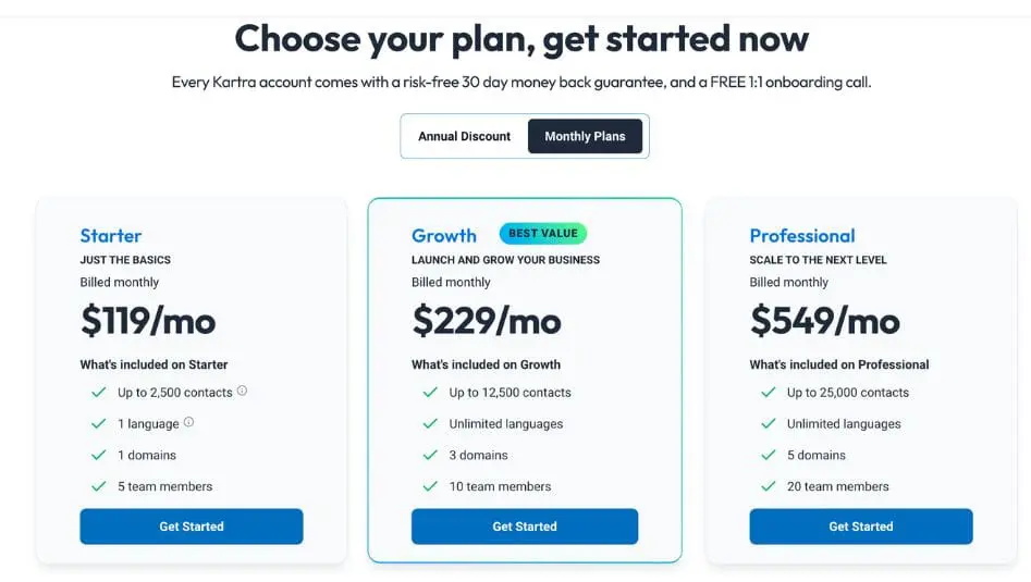 Kartra'nın fiyatlandırması, sağlam bir pazarlama araç setine ihtiyaç duyan kullanıcılar için dolar başına daha fazla değeri temsil edebilecek daha geniş özellik yelpazesini ve yerleşik yeteneklerini yansıtıyor.