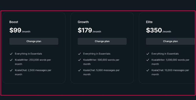 - KoalaWriter, yüksek kaliteli yapay zeka içerik üretimi için basit, erişilebilir fiyatlandırma sunar
