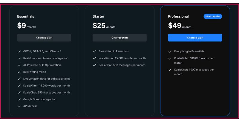 Essentials planıyla hem KoalaWriter'a hem de KoalaChat'e aylık düşük bir ücret karşılığında erişebilirsiniz.