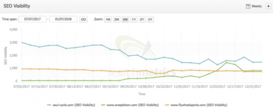 SoulCycle'ın Görünürlük grafiğine bir bakış, stratejideki ilk başarıyı gösterir. Bununla birlikte, Peloton'un SEO çabaları çekiş kazanıyor gibi görünürken, yıl ilerledikçe SoulCycle görünürlüğünün azaldığını görebilirsiniz. Bu, Peloton'un evde, isteğe bağlı sınıflarına atfedilebilir. Bu, SoulCycle'ın içerik pazarlama ekibinin bu yıl boyunca stratejilerini geliştirirken akıllarında tutmak isteyebilecekleri bir şey olabilir.