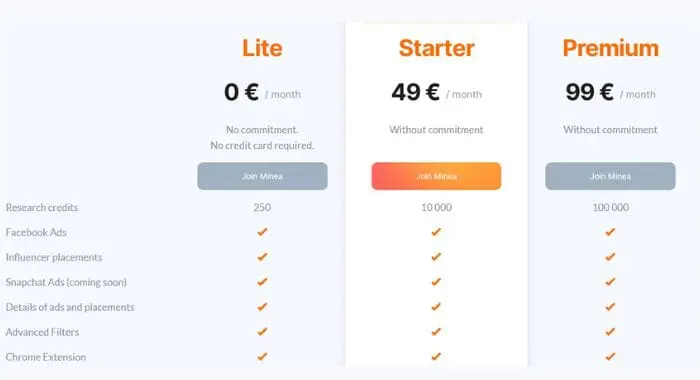 Minea'nın üç fiyatlandırma planı vardır: Lite, Başlangıç planı ve Premium plan
