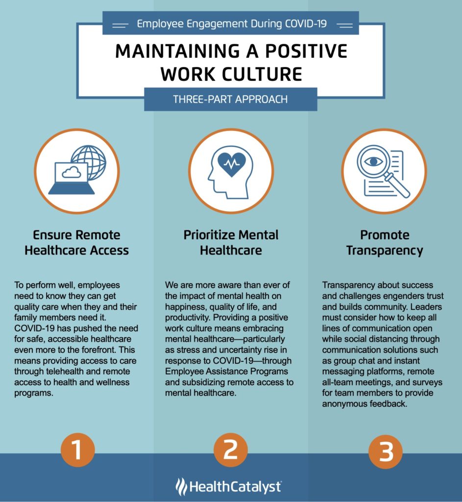 Health Catalyst, şirketlerin çalışanlarının ruh sağlığını desteklemelerine yardımcı olabilecek üç farklı yol sunar. Sağlıklı bir iş gücünün ısrarı, işyeri trendlerindeki birçok değişiklikten biri olacaktır. Çalışanlarınızın sağlık hizmetlerine kolayca erişebileceklerini, ruh sağlıklarının öncelikli olduğunu bilmelerini ve anlamalarını sağlamak ve açık kapı iletişim politikasına sahip olmak, çalışanlara kendilerini güvende ve emniyette hissedecekleri bir çalışma ortamı sağlar.