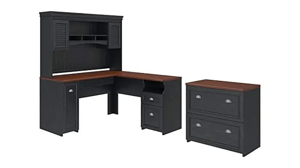 Bu mobilya seti, 28 "ila 45" yüksekliğe ayarlanabilen bir masa, 2 açılır kapanır kapılı bir kulübe, geniş bir kapalı depolama alanı, kablo yönetimi, 2 büyük kağıt raf ve 2 yardımcı çekmeceli ve 1'li bir kaide içerir. dosya çekmecesi. Bu setteki her parça, kalın, dayanıklı çalışma yüzeyleri ve çizilmeye karşı dayanıklı bir yüzey ile yüksek yoğunluklu ticari sınıf sunta ve melaminden yapılmıştır.