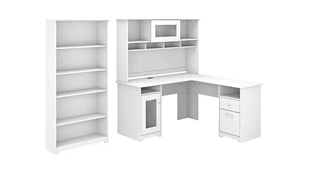 Bu setteki 60" W masa, yerleşik kablo yönetimi, 4 bağlantı noktalı bir USB hub ve şık, yivli bir cam kapı içerir. Barınak, L şeklindeki masanın her iki tarafına monte edilir ve açılıp kapanabilen yivli cam kapılı kapalı bir saklama bölmesine sahiptir. Kitaplık 2 sabit ve 2 ayarlanabilir olmak üzere 5 rafa sahiptir. Parçalar kompozit ahşap ve camdan yapılmıştır.
