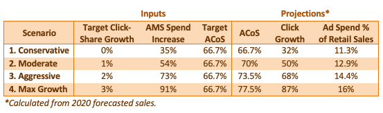 Bir senaryo karşılaştırmasını gösteren yukarıdaki grafik, bir Pacvue istemcisi için gerçek bir tahmine dayanmaktadır. Kategorinin büyümesi nedeniyle, verilerimiz, kategori içinde sabit bir tıklama payını korumak için AMS harcamasının en az %35 oranında artması gerektiğini gösterdi. Harcamadaki daha fazla artış, toplam tıklamaları önemli ölçüde iyileştirdi, ancak ACoS ayni olarak arttıkça azalan bir getiri noktasına yaklaştı.