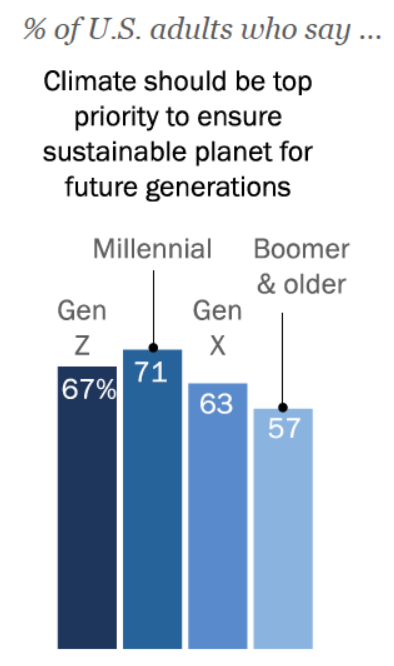 Z kuşağı ve Y kuşağı, yaşlı yetişkinlerle karşılaştırıldığında, iklim değişikliği konusunda harekete geçme ihtiyacı hakkında daha fazla konuşuyor, sosyal medyada daha fazla iklim değişikliği içeriği görüyor ve gönüllülük ve mitinglere katılmak gibi dahil olmak için daha fazlasını yapıyor.