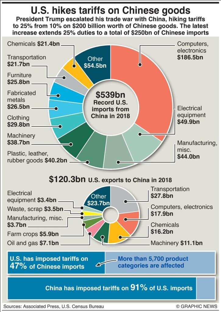 Şüphesiz, ABD'nin Çin'i en sert şekilde hedef aldığının farkındasınız çünkü haksız ticaret uygulamalarının yıllardır devam ettiğini iddia etti – bu hemen Halk Cumhuriyeti'nden misilleme tehditlerine neden oldu. İlk olarak ABD, 50 milyar dolarlık ithal Çin mallarına %25'lik bir gümrük vergisi koydu. Çin, 34 milyar dolarlık bir tarife ile karşılık verdi ve böylece kısasa kısasa bir ticaret savaşında savaşan iki güçlü ekonominin domino etkisi başladı. Mayıs ayında ABD, 200 milyar dolarlık Çin malına gümrük vergisi koydu ve buna karşılık Çin, 60 milyar dolarlık ABD ithalatına gümrük vergisini artırdı.