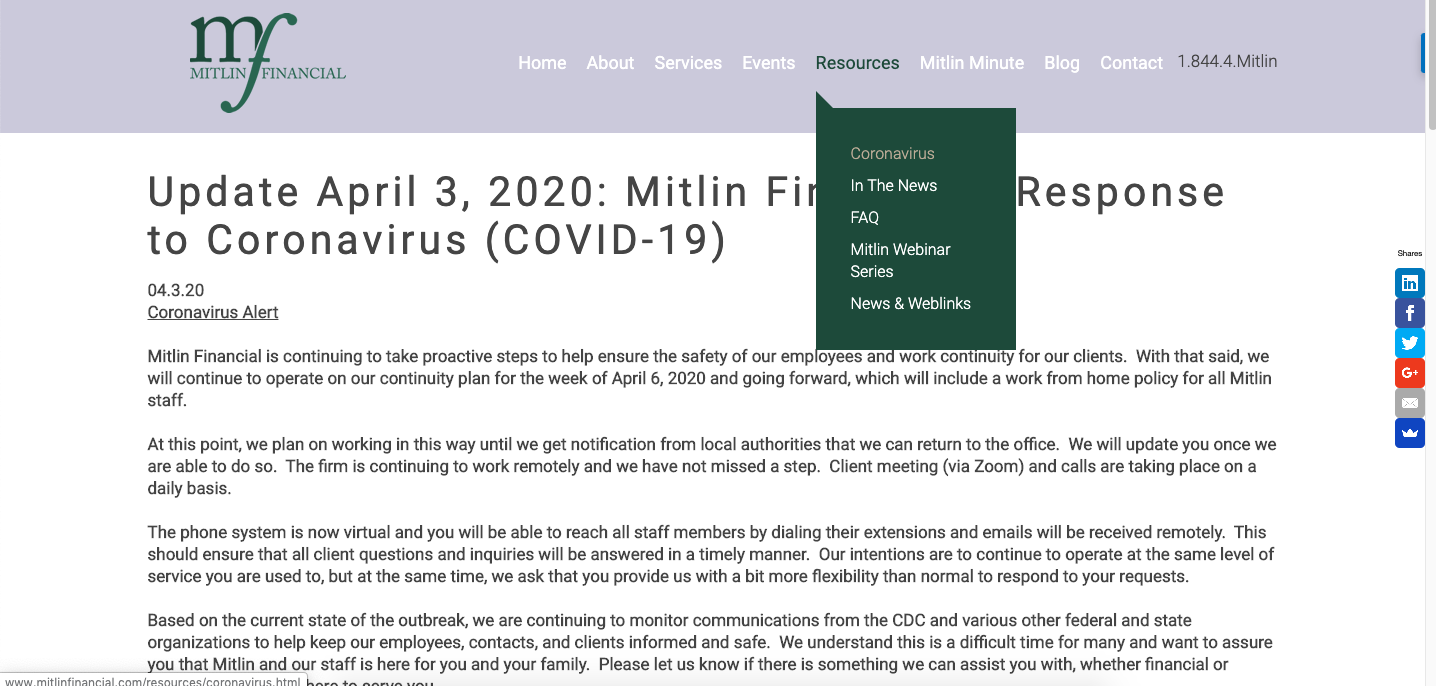 Mitlin finanstan bu örneği seviyoruz - müşterileri ve potansiyel müşterileri için yalnızca Coronavirus güncellemelerini barındırmak için web sitelerindeki kaynaklar bölümünün altında ayrı bir Coronavirus alt sayfası oluşturdular. Bu, insanların virüs hakkında güncel bilgiler için başvurabilecekleri türden bir "ana üs" oluşturmak için harika bir yaklaşım.