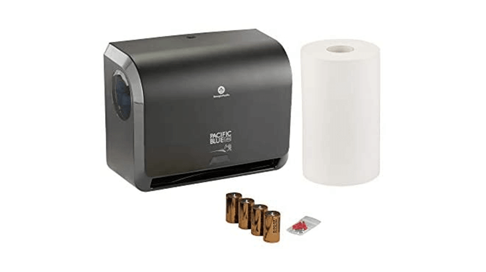 Pacific Blue 的自动纸巾分配器可容纳 1,150 英尺的毛巾。 您可以在每次分配时选择 14 或 11 英寸的毛巾长度。 它采用运动激活且无触摸,由塑料制成,使用 4 D 电池运行。