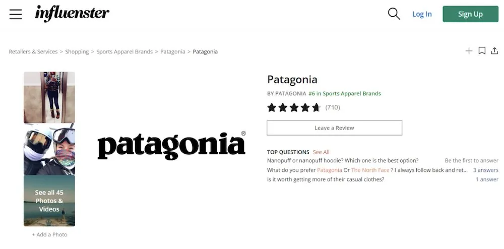 我们已经在上面提到了评论在为您的产品提供社会证明方面的有效性。 要增加评论数量,最好优化您在评论网站上的个人资料。 例如,户外用品零售商 Patagonia 在评论网站 Influenster 上有超过 710 条评论,其中包括许多高质量的产品图片。