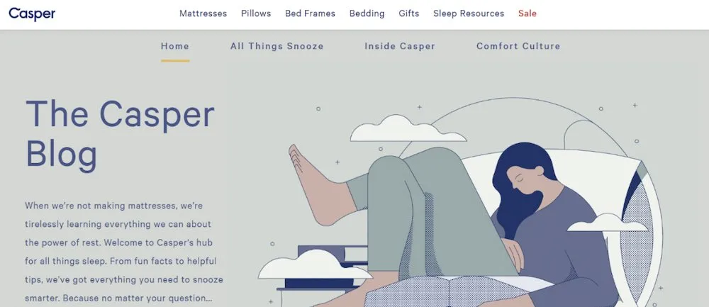在上面的示例中,电子商务品牌 Casper 在其网站上创建了一个博客部分作为内容中心,并使用它来发布产品指南、产品建议文章和许多其他形式的内容。